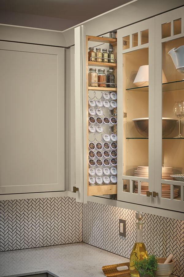 Enjoy practical function with our K-Cup Pullout Storage Cabinet that holds 44 pods and easily glides out with a gentle pull.  Perfect for adding organization to a small space that often goes unused.